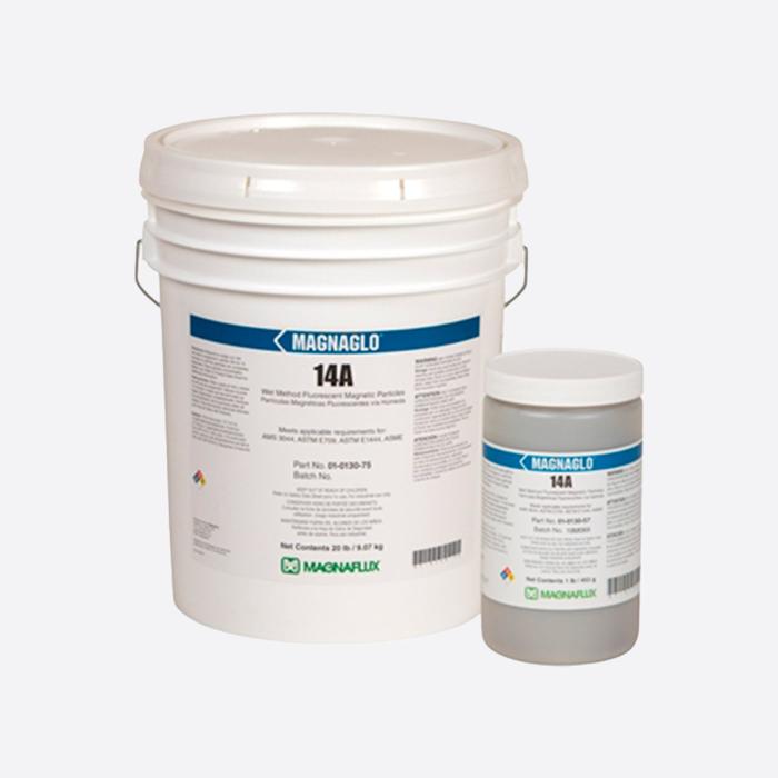 14A es un polvo de partículas magnéticas fluorescentes muy sensible que sirve para ubicar interrupciones muy finas en aplicaciones críticas. Puede mezclarse con aceite o con agua y se usa en sistemas de inspección de baño de partículas fluorescentes húmedas. La mezcla líquida de 14A se pulveriza sobre una pieza durante su magnetización. Se utiliza para detectar grietas y costuras, además de inclusiones, regazos, roturas y escamas. Los defectos detectados por este proceso pueden ser fisuras hacia la superficie de la pieza o estar apenas por debajo de la superficie. Las piezas sometidas a pruebas pueden ser forjaduras, soldaduras, moldeados y materiales ferromagnéticos estampados o trabajados a máquina, como acero y otras aleaciones de hierro, níquel y cobalto.